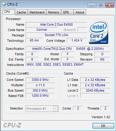 | Разгон, максимально стабильная частота (FSB x Ratio) | 3300 (300 x 11.0) |