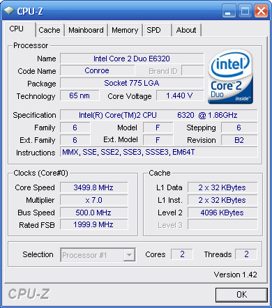 | Разгон, максимально стабильная частота (FSB x Ratio) | 3500 (500 x 7.0) |