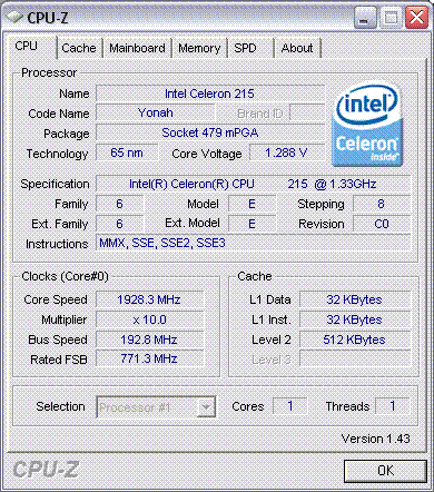 Процессор Celeron-215 (Core Solo) впаянный в плату. За разгон спасибо автору SetFSB 2.0.b.19j. Дальше 1928 FSB не повышается. Память поставлена как DDR2/400-5-5-5-15.