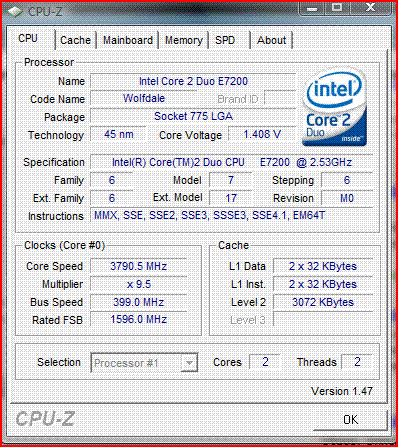 | Разгон, максимально стабильная частота (FSB x Ratio) | 3790 (399 x 9.5) |