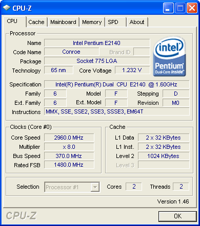 | Разгон, максимально стабильная частота (FSB x Ratio) | 2960 (370 x 8.0) |