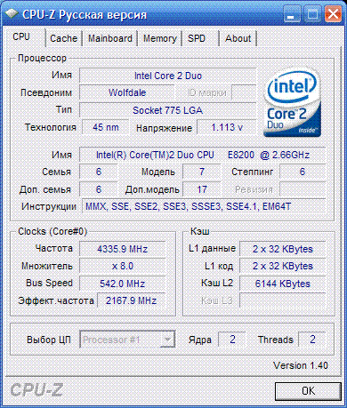 | Процессор (ядро) | Intel Core 2 Duo (Wolfdale) |