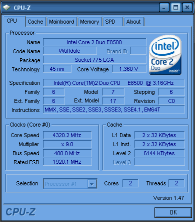 | Разгон, максимально стабильная частота (FSB x Ratio) | 4320 (480 x 9.0) |