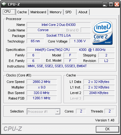 | Разгон, максимально стабильная частота (FSB x Ratio) | 2880 (320 x 9.0) |