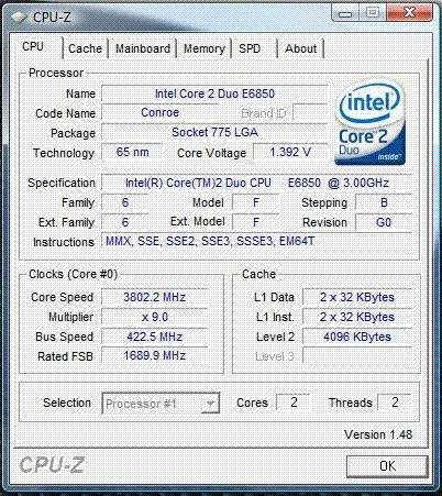 | Разгон, максимально стабильная частота (FSB x Ratio) | 3798 (422 x 9.0) |