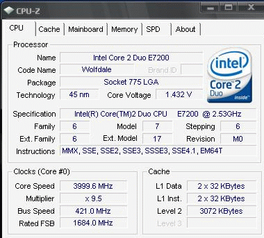 | Разгон, максимально стабильная частота (FSB x Ratio) | 3999 (421 x 9.5) |