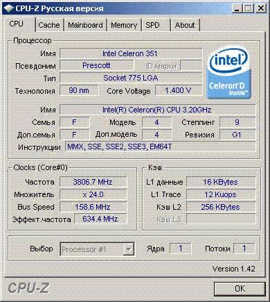 | Процессор (ядро) | Intel Celeron D (Prescott-256) |