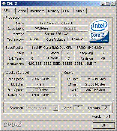 | Разгон, максимально стабильная частота (FSB x Ratio) | 4056 (427 x 9.5) |