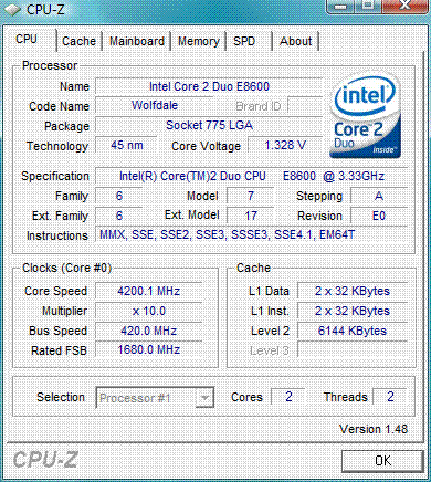 | Разгон, максимально стабильная частота (FSB x Ratio) | 4200 (420 x 10.0) |