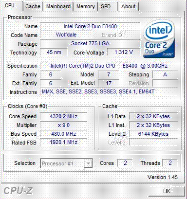 | Разгон, максимально стабильная частота (FSB x Ratio) | 4320 (480 x 9.0) |