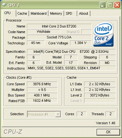 | Разгон, максимально стабильная частота (FSB x Ratio) | 3876 (408 x 9.5) |