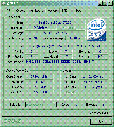 | Разгон, максимально стабильная частота (FSB x Ratio) | 3790 (399 x 9.5) |