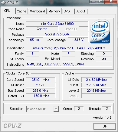 | Разгон, максимально стабильная частота (FSB x Ratio) | 3540 (295 x 12.0) |