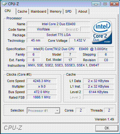 | Разгон, максимально стабильная частота (FSB x Ratio) | 4248 (472 x 9.0) |