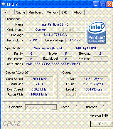Мать на 650sli для разгона не очень, на шине больше 350МГц работать не хочет, память стоит на 700МГц. Конечно радует, что не пришлось повышать вольтаж на проце, только на северном мосту. Энергосбережение оставил работать, прыгает нормально, при снижении напряжения не вылетает.