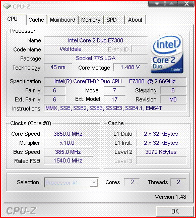 | Разгон, максимально стабильная частота (FSB x Ratio) | 3850 (385 x 10.0) |