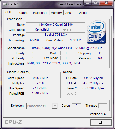 | Разгон, максимально стабильная частота (FSB x Ratio) | 3708 (412 x 9.0) |