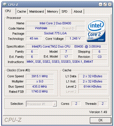 Температура CPU снималась с ядер c помощью утилиты RealTemp 2.70, прчем в том месте, где находился комп была температура 22C. Стабильность работы компа проверялась с помощью утилиты Prime95 v25.6 build 6 (в каждом из имеющихся режимов комп тестировался в течении 24 ч.). Ревизия CPU - C0. В компе была оперативка типа DDRII-800, в которую разгон и уперся. Зато этот разгон был абсолютно бесплатен...:)
