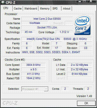 | Разгон, максимально стабильная частота (FSB x Ratio) | 3904 (411 x 9.5) |