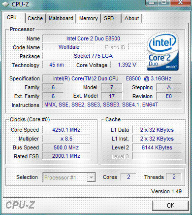 | Разгон, максимально стабильная частота (FSB x Ratio) | 4250 (500 x 8.5) |