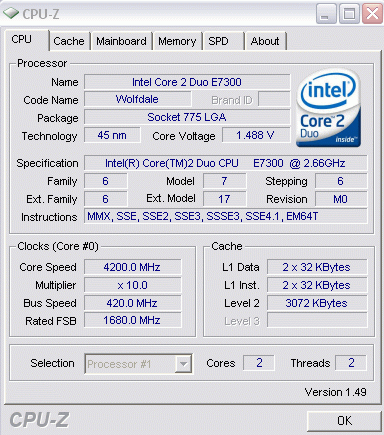 | Разгон, максимально стабильная частота (FSB x Ratio) | 4200 (420 x 10.0) |