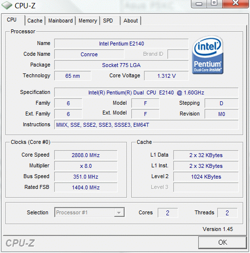 | Процессор (ядро) | Intel Pentium Dual-Core (Conroe-1M) |