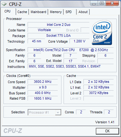 | Разгон, максимально стабильная частота (FSB x Ratio) | 3600 (400 x 9.0) |
