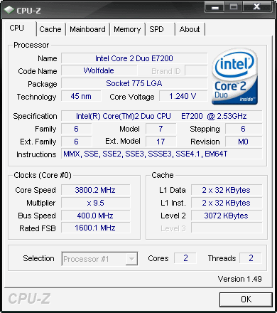 | Разгон, максимально стабильная частота (FSB x Ratio) | 3800 (400 x 9.5) |