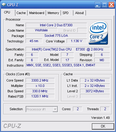 | Разгон, максимально стабильная частота (FSB x Ratio) | 3300 (330 x 10.0) |