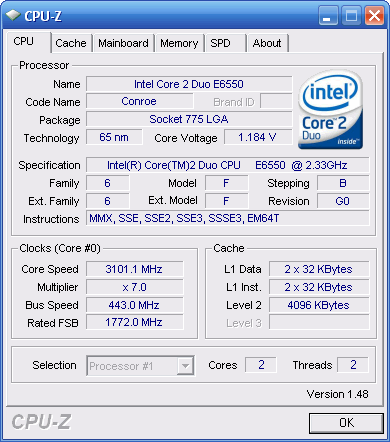 | Разгон, максимально стабильная частота (FSB x Ratio) | 3101 (443 x 7.0) |