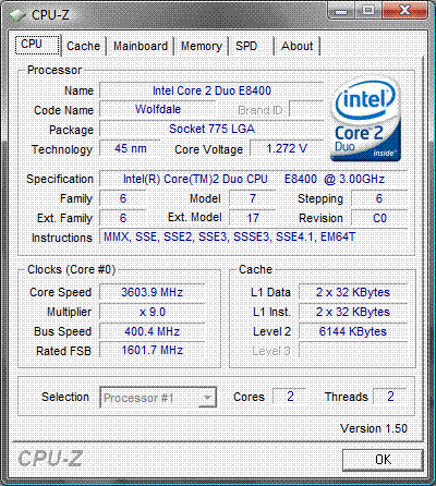 | Разгон, максимально стабильная частота (FSB x Ratio) | 3600 (400 x 9.0) |