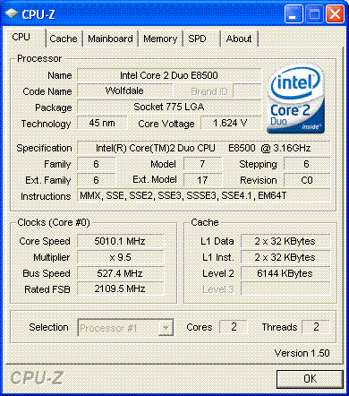 | Разгон, максимально стабильная частота (FSB x Ratio) | 5006 (527 x 9.5) |