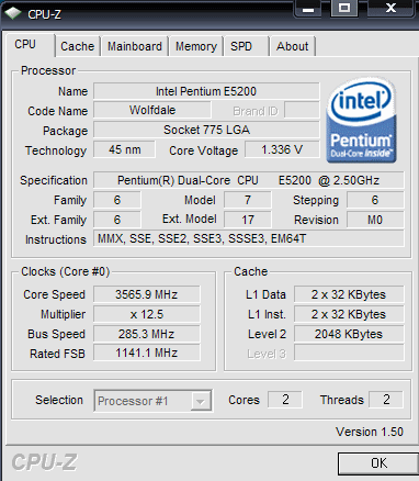 | Разгон, максимально стабильная частота (FSB x Ratio) | 3562 (285 x 12.5) |