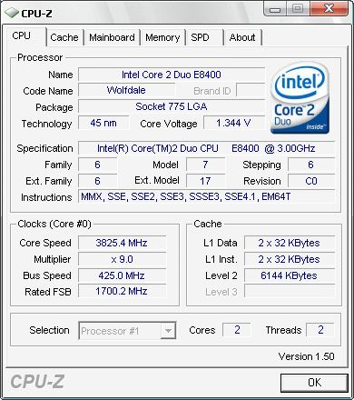 | Разгон, максимально стабильная частота (FSB x Ratio) | 3825 (425 x 9.0) |