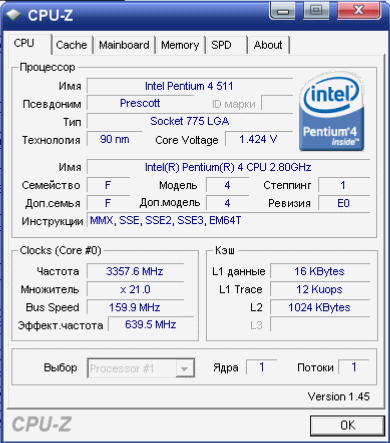 | Процессор (ядро) | Intel Pentium 4 (Prescott) |