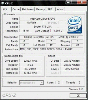 | Разгон, максимально стабильная частота (FSB x Ratio) | 3201 (337 x 9.5) |