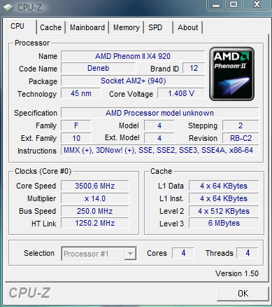 | Процессор (ядро) | AMD Phenom II X4 (Deneb) |