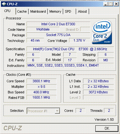 | Разгон, максимально стабильная частота (FSB x Ratio) | 3800 (400 x 9.5) |