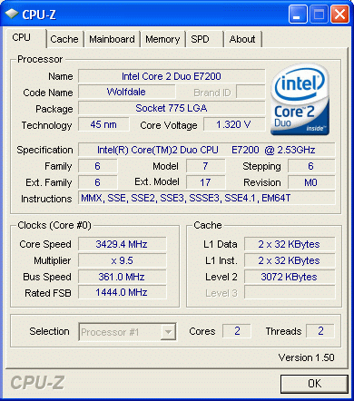 | Разгон, максимально стабильная частота (FSB x Ratio) | 3429 (361 x 9.5) |