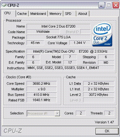 | Разгон, максимально стабильная частота (FSB x Ratio) | 3690 (410 x 9.0) |