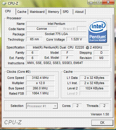 | Разгон, максимально стабильная частота (FSB x Ratio) | 3192 (266 x 12.0) |