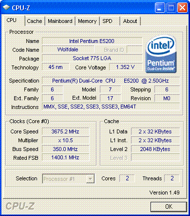 | Разгон, максимально стабильная частота (FSB x Ratio) | 3675 (350 x 10.5) |