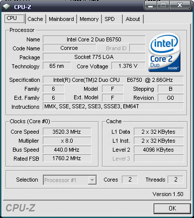 | Разгон, максимально стабильная частота (FSB x Ratio) | 3520 (440 x 8.0) |