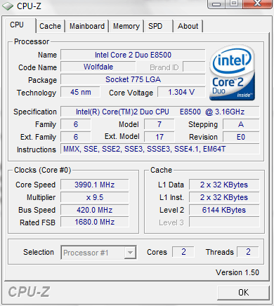 | Разгон, максимально стабильная частота (FSB x Ratio) | 3990 (420 x 9.5) |