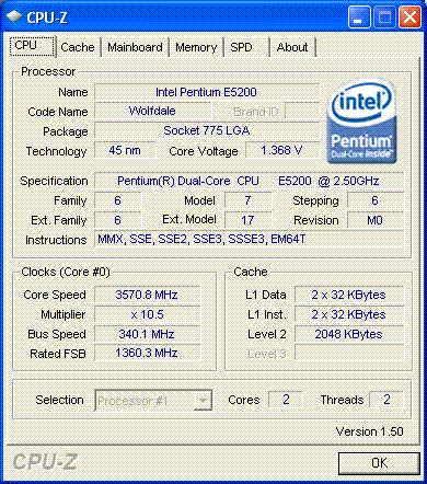 Процессор Costa Rica, очень любит напряжение, при 1.5 В покоряет 340*12.5=4250, дальше FSB стенка, проходит 3D MARK, но в ОССТ ошибка 1 ядра, при 3.500 Мгц, достаточно напряжения 1.33, если дальше гнать уже надо более 1.44... Оставил странное ощущение данный ЦП, так как для разгона за 3.500 требует очень большое напряжение.. да и FSB стенка думал будет выше... на постоянку оставил то что на скрине