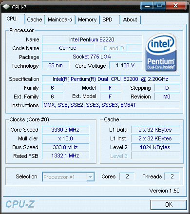 | Разгон, максимально стабильная частота (FSB x Ratio) | 3330 (333 x 10.0) |
