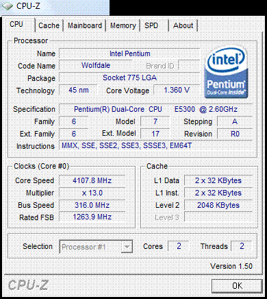 | Разгон, максимально стабильная частота (FSB x Ratio) | 4108 (316 x 13.0) |