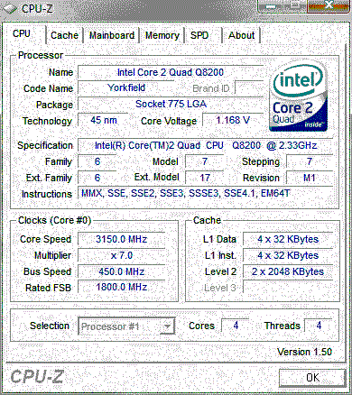 | Разгон, максимально стабильная частота (FSB x Ratio) | 3150 (450 x 7.0) |
