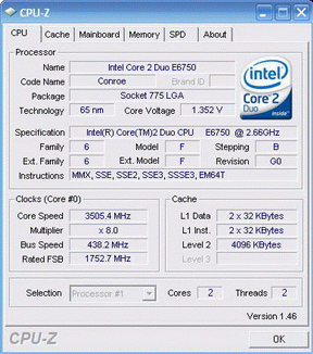 | Разгон, максимально стабильная частота (FSB x Ratio) | 3504 (438 x 8.0) |