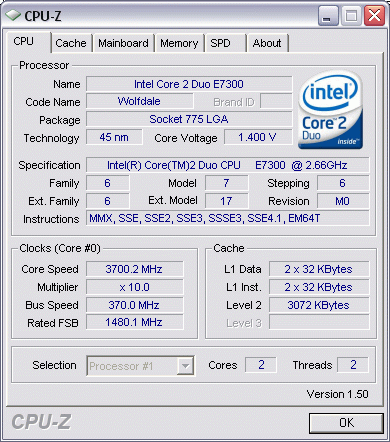 | Разгон, максимально стабильная частота (FSB x Ratio) | 3700 (370 x 10.0) |